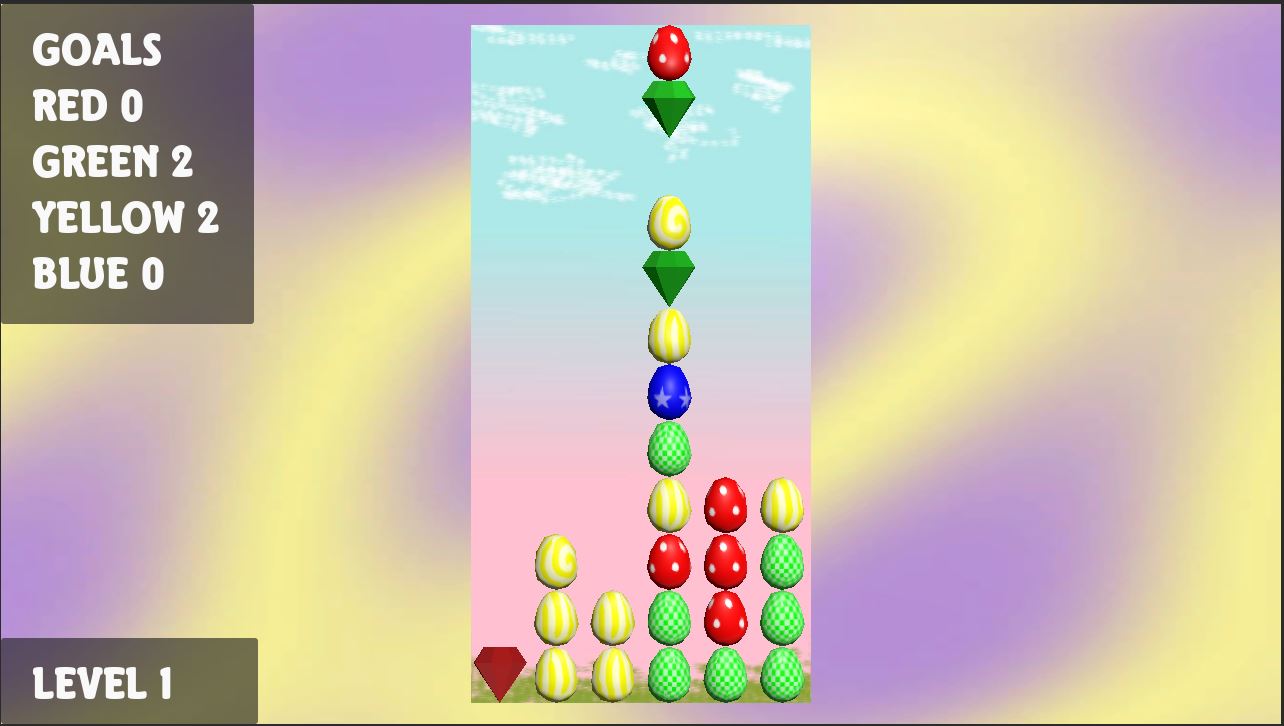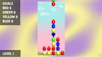 In this puzzle game, colored eggs (red, green, yellow blue) fall in pairs. You must crash the easter eggs using gems of the same color. Crash the number of eggs specified in the goals to move to the next level.